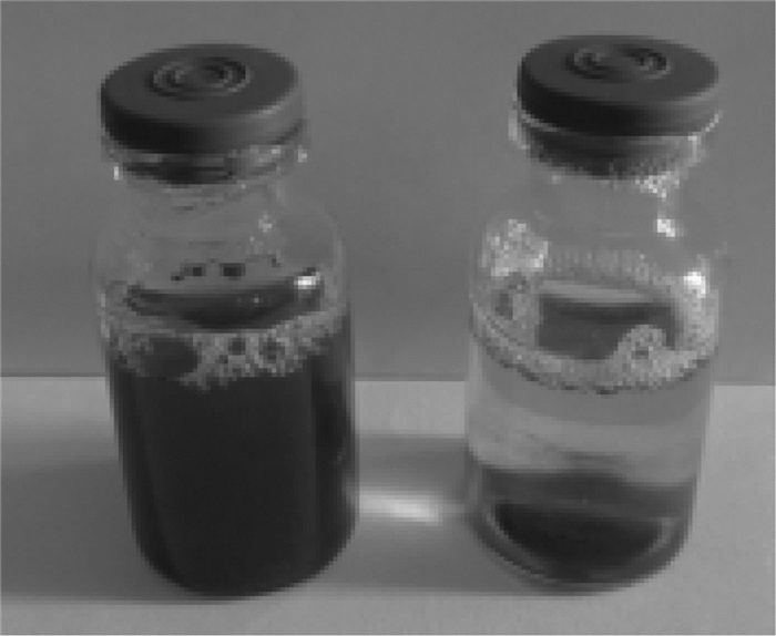 图 1 磁性分离前后的AF@Fe3O4 Fig. 1 AF@Fe3O4 before and after magnetic separation |