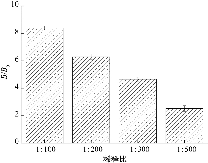鉴于此,本实验采用不同稀释比进行ELISA方法表征人工抗原DON@AF@Fe3O4.首先采用单抗识别人工抗原DON@AF@Fe3O4,通过洗涤除去未作用的单抗后,进一步在体系中加入酶标二抗,洗涤后加入底物进行显色反应,ELISA表征结果如图 6所示.可以看出,随着稀释比的增大,吸光度阳性/空白值(B/B0)降低,表明人工抗原DON@AF@Fe3O4具备免疫活性.结合扫描电镜、紫外吸收光谱、EDX元素分析的结果,进一步证明人工抗原DON@AF@Fe3O4制备成功.