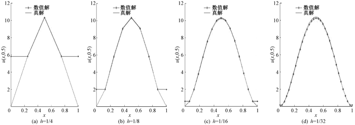 从表 1的结果可以看出,随着网格加密,数值解与真解的误差逐步减小。图 1绘制了网格逐渐加密(τ=h2)时的真解与数值解的图像。可以看到,随着网格加密,数值解收敛到真解。