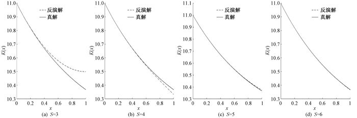 由于截断误差的存在, 理论上逼近空间维数越高, 反演结果应该越精确。应用不带扰动的数据, 分别在逼近空间维数S=3, 4, 5, 6时,对K(x)进行反演重建。初始迭代取a0=(1, 0), 其中0表示相应维数的零向量。在不同维数逼近空间中的反演解与真解的图像如图 2所示。
