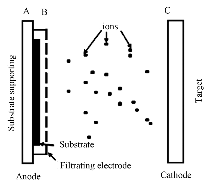利用磁控溅射技术制备TiO2薄膜过程中,等离子体中除了沉积粒子Ti4+、O2-、O-以外,还有大量的二次电子.这些二次电子会对衬底以及已沉积的薄膜产生溅射损伤,影响薄膜的结构和质量[8].为减少这种溅射损伤,我们对CS-300直流磁控溅射系统进行改进,在靶材与衬底之间靠近衬底一侧加装一平行于衬底的过滤电极,并与衬底支架导电连接,我们将改进后的技术称为能量过滤磁控溅射技术(energy filtering magnetron sputtering, EFMS).该技术中的过滤电极为厚度0.1 mm的不锈钢金属网,Ti靶阴极与衬底支架阳极间距70 mm, 过滤电极距衬底支架6 mm, 改进后的沉积室内部结构如图 1所示.