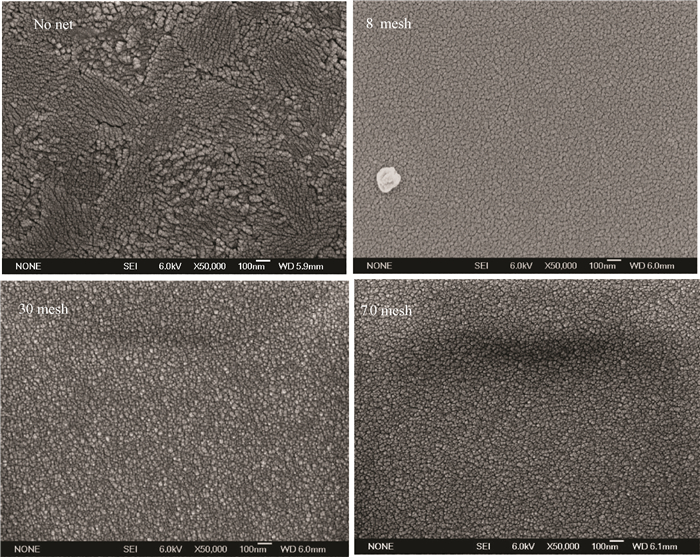 1.1 EFMS技术过滤电极目数对TiO2薄膜微结构的影响研究首先研究了能量过滤磁控溅射技术网状过滤电极网孔目数对薄膜微结构的影响.研究发现过滤电极网孔目数为8目时,所制备的TiO2薄膜晶粒最小,薄膜表面最均匀,故后期制备叠层TiO2薄膜时均使用8目不锈钢金属网作为过滤电极.图 2为不同网孔目数过滤电极条件下制备的TiO2薄膜扫描电镜图片.