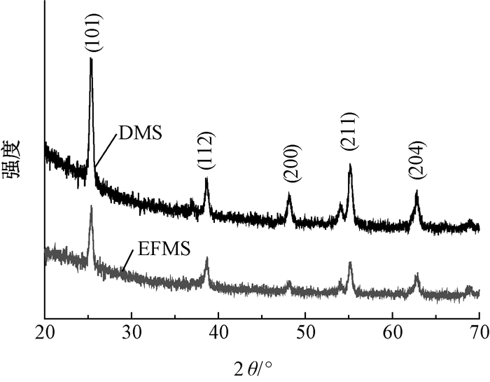 图 4为利用DMS和EFMS技术制备的单层TiO2薄膜的XRD图谱.从图中可以看出薄膜均有明显的衍射峰,且峰型尖锐,说明薄膜的结晶性良好.与TiO2的标准PDF卡比较,位于25.3°处的最强衍射峰对应(101)晶面,表明薄膜为四方晶系的锐钛矿结构.根据Scherrer[9]公式