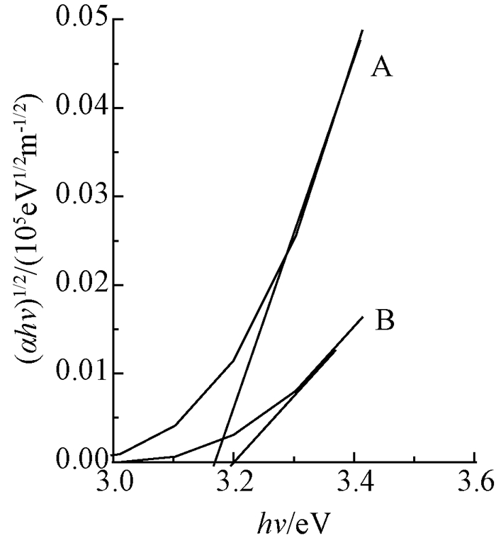 其中:k为消光系数;λ为入射光波长.以(αhν)1/2为纵坐标,hν为横坐标作图,如图 7所示,得出样品A和样品B的光学带隙大致为3.17 eV和3.21 eV.