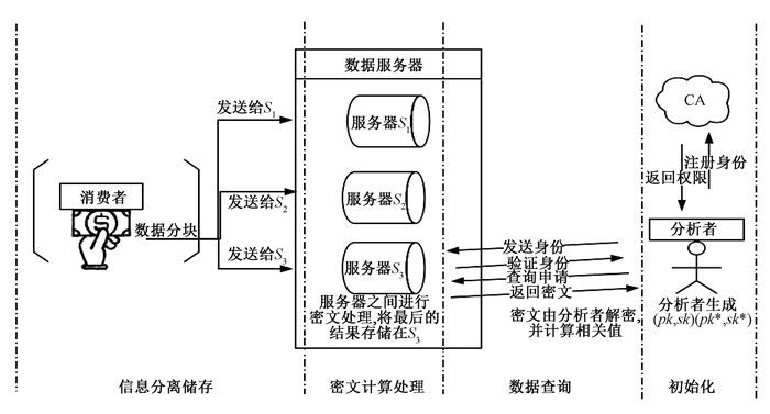 数据服务器S:每个数据服务器对收到的数据加密并存储.接受到分析者的查询请求,服务器间配合完成密文上的安全计算,对于不同合法请求给予不同密文.