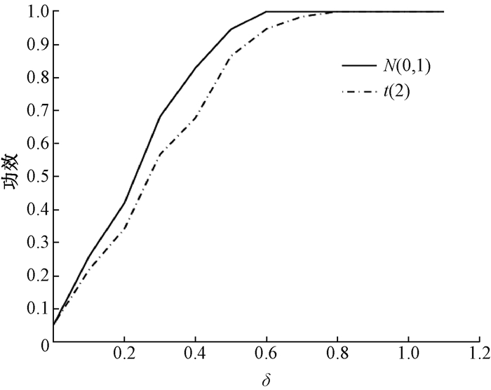 图 1给出了n=100,T=8时的检验功效函数。从图 1可以看出,当原假设成立,即δ=0时,检验统计量的功效接近0.05;当备择假设成立,即δ > 0时,检验统计量的功效随着δ的增加而快速变大。结果表明,所构造的检验统计量对备择假设是敏感的。从表 2也可以看出,经验拒绝频率都接近理论水平0.05,且所提方法对误差分布假设也是稳健的。因此,本文提出的序列相关检验方法是可行的。