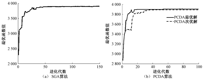 采用标准遗传算法(SGA)和本文的PCDA算法对Rosenbrock函数求解最优,结果如图 3所示.由图 3(a)可知,SGA算法在140代左右稳定在得到的最优解处,此时得到的最优解为3 897.725,即算法陷入了局部最优解; 由图 3(b)可知,大概进化到4代时,种群根据个体的特征划分为多种群,使大概在54代时PCDA算法得到了两个稳定的解,实线是PCDA算法得到的最优解(3 905.926),虚线是PCDA算法得到的次优解(3 897.731).由此可得:PCDA算法收敛速度快,能同时得到全局最优解和次优解,有利于全局分析.