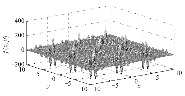 | $ f\left( {x, y} \right) = \sum\limits_{i = 1}^5 {i{\rm{cos}}\left[{\left( {i + 1} \right)\cdot x + i} \right]} \cdot\sum\limits_{i = 1}^5 {i{\rm{cos}}\left[{\left( {i + 1} \right)\cdot y + i} \right]}, x, y \in \left[{-10, 10} \right]. $ | (5) |