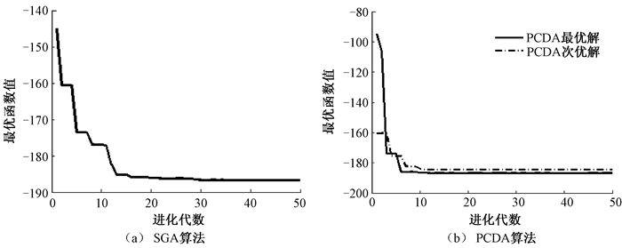 由于篇幅所限,各个算法的进化图不能全部展示.图 5(a)、(b)分别是SGA算法和PCDA算法对Shubert函数进行全局寻优的进化图,达到最大代数,进化终止.由图 5可以看出,PCDA算法确实收敛速度快并且能够搜索到最优点.