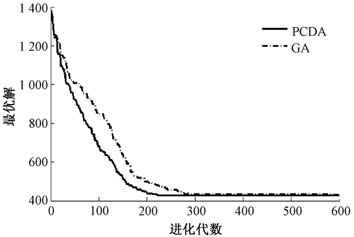 取种群数N=100,迭代次数为600,个体长度M=51,交叉率Pc=0.9,Pc1=0.9,Pc2=0.6,变异率Pm=0.05,Pm1=0.05,Pm2=0.001,随机运行10次.PCDA算法运行结果的最优解为429.118,次优解为438.012,而文献[22]中GA算法得到最优解为433.443. PCDA算法运行到222代就得到了最优路径(见图 6),比GA算法的300代提前了很多. PCDA算法和GA算法的进化过程如图 7所示.