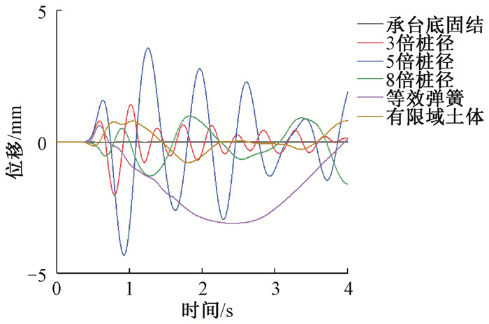 图 9和图 10分别为承台顶部横桥向和纵桥向位移时程曲线。由图 9可知,承台底固结模型墩台顶部的最大横桥向位移为0.34 mm;3倍、5倍、8倍桩径模型的值分别为3.24 mm、9.01 mm和20.19 mm;等效弹簧法模型的值为27.92 mm;有限域土体法模型的值为18.50 mm。就横桥向位移来看,承台底固结模型的计算位移峰值与桩土作用模型完全不在一个数量级,8倍桩径模型的最大横桥向位移与等效弹簧法模型和有限域土体法模型的情况接近。3倍和5倍桩径模型的墩顶振动频率较大,等效弹簧法模型的墩顶振动频率较小,8倍桩径模型和有限域土体法模型的情况则基本一致。由图 10可知,承台顶部纵桥向位移与横桥向位移具有相似规律。不同的是,由5倍桩径模型与等效弹簧法模型得到的承台顶部纵桥向位移相对较大,分别为4.43 mm和3.19 mm,由3倍桩径、8倍桩径和有限域土体法模型得到的承台顶部纵桥向位移较小,分别为2.35 mm、1.32 mm和1.04 mm,而由承台底固结模型得到的位移结果仅为0.02 mm。由承台顶部横桥向和纵桥向位移时程曲线可知,在船桥碰撞过程中,不考虑桩土作用得到的桥梁响应往往远小于实际情况,尤其是在桥梁上部结构。综上所述,在进行桥梁船撞分析时,如果不考虑桩土作用的影响,船撞力的计算结果偏小,而桩土作用模型计算的撞击力约为承台底固结模型计算值的1.22倍;不考虑桩土作用的模型的船撞持续时长偏大,桥梁的响应则远远小于桩土作用模型的计算结果。因此,桩土作用是船桥碰撞分析中不可忽视的影响因素。
