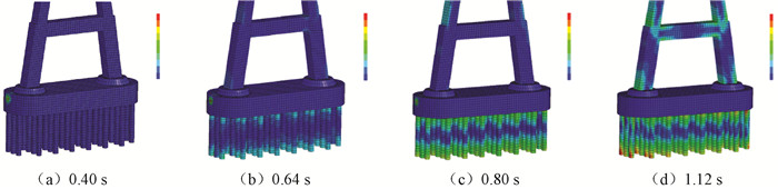 在船桥碰撞有限元模拟过程中,由于建模方式的不同,桥墩在不同桩土模型下所得到的动力响应也有所不同。在上述计算结果的基础上,进一步分析不同桩土模型计算的桥墩动力响应的差别。图 11为8倍桩径模型在0.40 s、0.64 s、0.80 s和1.12 s的桥墩Mises应力云图。可以看出,图 11(a)中船桥刚刚发生碰撞,应力集中产生在承台被撞击部位。随着撞击的持续,由图 11(b)和(c)可见,桩顶和桩底应力逐渐增大。图 11(d)中船桥碰撞已经结束,桩顶和桩底产生很大的应力,桥墩上部结构也产生一定应力。显然,桥墩产生较大应力处位于桩顶,因此船桥碰撞过程中桥梁最易发生损坏的部位在桩顶与承台相接处。
