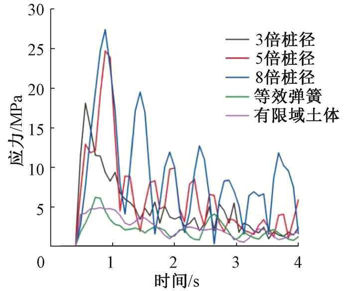 由于桥墩受船舶撞击后应力集中产生在桩顶位置,故提取由不同桩土模型计算的桩顶应力进行对比分析。图 12为不同桩土模型的桩顶应力时程曲线。可以看出,嵌固端模型的桩顶应力相对较大,3倍、5倍、8倍桩径模型的桩顶应力峰值分别为18.1 MPa、24.7 MPa和27.4 MPa,而等效弹簧法模型和有限域土体法模型的桩顶应力峰值较小,分别为6.16 MPa和4.73 MPa。产生这种差别的原因是嵌固端模型仅将桩在一定深度处固结,桩周围没有设置任何约束,而等效弹簧法模型和有限域土体法模型的桩周都有相应的约束存在。因此,应用嵌固端模型,桩顶和桩底产生的应力相对较大。如果进行桩顶应力分析,采用等效弹簧法模型和有限域土体法模型得到的计算结果更加准确。