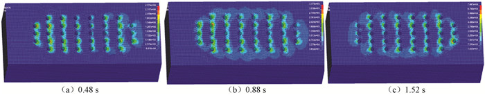 在计算过程中使用不同桩土模拟方法,桩的受力情况也会有差别。由图 11可见,在船桥碰撞过程中,采用嵌固端模型,每一根桩的受力情况几乎相同,而这种受力状态也出现在等效弹簧法模型中。有限域土体法模型中桩的受力情况则与这2种桩土模型不一致,图 13为有限域土体法模型在0.48 s、0.88 s和1.52 s的土体Mises应力云图。由图 13(a)可见,从左至右前两列和后两列桩周土体产生的应力明显大于中间两列桩周土体的应力。由图 13(b)和(c)可见,内侧桩周土体的应力明显小于外侧桩周土体的应力。由此可知,由于桩周边界条件的不同,有限域土体法模型中桩的受力情况与嵌固端模型和等效弹簧法模型有一定差别,由有限域土体法模型得到的计算结果更贴近于实际情况。