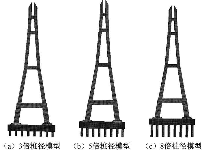2 船桥碰撞分析模型 2.1 主塔有限元模型考虑到航运实际情况和该流域船桥碰撞事故多发的特点,选取南京长江三桥北主墩进行有限元建模。北主墩墩基为哑铃型圆形桩承台,宽29 m,高12 m,总长为84 m。塔墩处河床高程为-9 m。图 1为南京长江三桥总体布置图,北主墩位于图中左侧。采用整体式桥墩建模,假设预应力筋和普通钢筋均匀分布在桥墩中,通过增加混凝土材料的弹性模量来考虑桥墩中钢筋的作用。主塔以实际尺寸建模,塔高215 m,建模时采用SOLID164单元,材料选取LS-DYNA中的HJC混凝土材料模型。主塔有限元模型如图 2所示。如果不考虑桩土作用,则将主塔底部承台底面进行固结约束,此模型为不考虑桩土作用的承台底固结模型。
