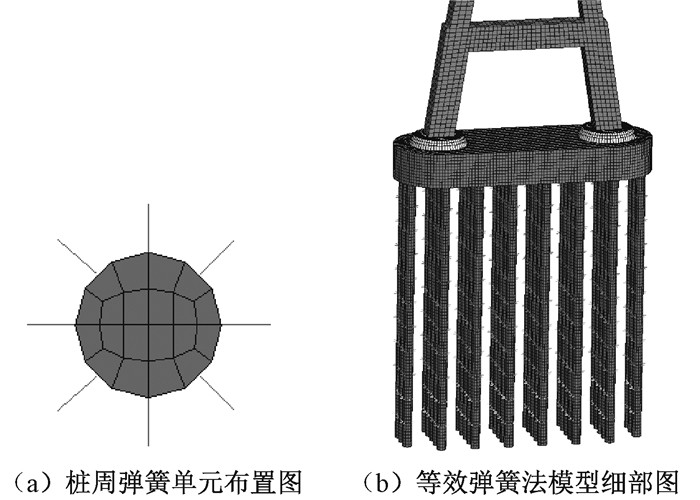 等效弹簧法是一种较为成熟的模拟桩土作用的方法,其将桩周土体视作一系列的弹簧,通过弹簧的约束模拟桩土作用。本模型桩长为88 m,每隔8 m布设一组弹簧,弹簧的布置和等效弹簧法模型如图 4所示。桩周弹簧的弹簧刚度由m法确定,等效弹簧刚度的计算公式为K=mzb0h0,式中:K为等效弹簧刚度;z为弹簧布置深度;b0为桩的等效宽度;h0为划分单元的高度;m值由桩所处地质条件确定。经查阅相关地质资料,最终确定每层弹簧的弹簧刚度。