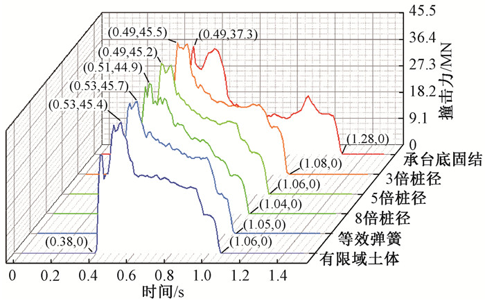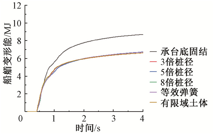 3.1 桩土作用对船桥碰撞动力响应的影响桥梁受船舶撞击的动力响应可通过后处理软件LS-PrePost提取得到。图 7给出了利用承台底固结模型、嵌固端模型、等效弹簧法模型和有限域土体法模型计算的撞击力时程曲线。可以看出,碰撞力产生的初始时刻均在0.38 s,随着碰撞的持续,碰撞力陡然加大,这些模型均在0.5 s左右产生最大碰撞力。等效弹簧法模型的撞击力最大,为45.7 MN;有限域土体法模型的撞击力为45.4 MN;3倍、5倍、8倍桩径模型的撞击力依次减小,分别为45.5 MN、45.2 MN和44.9 MN;而不考虑桩土作用的承台底固结模型的撞击力仅为37.3 MN。碰撞力在达到峰值之后会迅速减小,桩土作用模型的碰撞力均在1.06 s左右消失,而承台底固结模型的碰撞力则在1.28 s消失。仅从碰撞时长来看,承台底固结模型的碰撞持续时长明显大于桩土作用模型的碰撞时长。图 8为不同模型在船舶撞击过程中的船艏变形能时程曲线。可以看出,承台底固结模型的船艏变形能远大于其他几种模型,这也解释了采用承台底固结模型时,碰撞持续时长和撞击力大小与其他几种桩土模型有较大差异的原因。在船舶与桥墩碰撞过程中,由于不考虑桩土作用的模型是将承台底部直接固结,船舶与桥墩碰撞更类似于船舶与刚性墙的碰撞,船艏相对于其他模型会产生更大的变形,船艏变形所消耗的能量会更多,因此在整个碰撞过程中碰撞力也会相应减小。