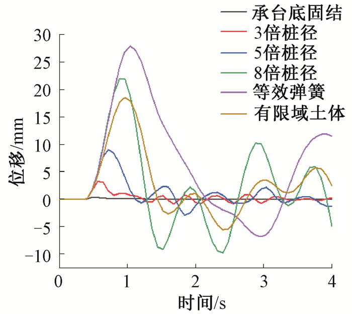 为了更直观地对比不同桩土模型数值模拟结果之间的差异,将不同模型的计算结果汇总于表 1。可以看出,嵌固端模型、等效弹簧法模型和有限域土体法模型计算所得撞击力大小和撞击时长基本一致。使用3倍和5倍桩径模型计算,其撞击力峰值在0.49 s时发生;使用等效弹簧法和有限域土体法模型计算,其撞击力峰值在0.53 s时发生。不同模型的承台顶部和桩顶的横桥向位移差别较大。使用3倍和5倍桩径模型时承台顶部横桥向位移较小,分别为3.24 mm和9.01 mm,使用8倍桩径模型时其值为20.19 mm,分别增大了5.23倍和1.24倍;由8倍桩径模型得到的横桥向位移与由其他2种桩土模型得到的横桥向位移差别不大。由不同模型得到的承台顶部和桩顶的纵桥向位移也有差别,其中8倍桩径模型与有限域土体法模型的计算结果相近。3倍、5倍、8倍桩径模型和等效弹簧法模型计算的桩顶应力分别为有限域土体法模型计算值的3.85倍、5.25倍、5.83倍和1.31倍,这种因使用不同桩土模型而产生的较大桩顶应力差异与桩周边界条件有密切关系。