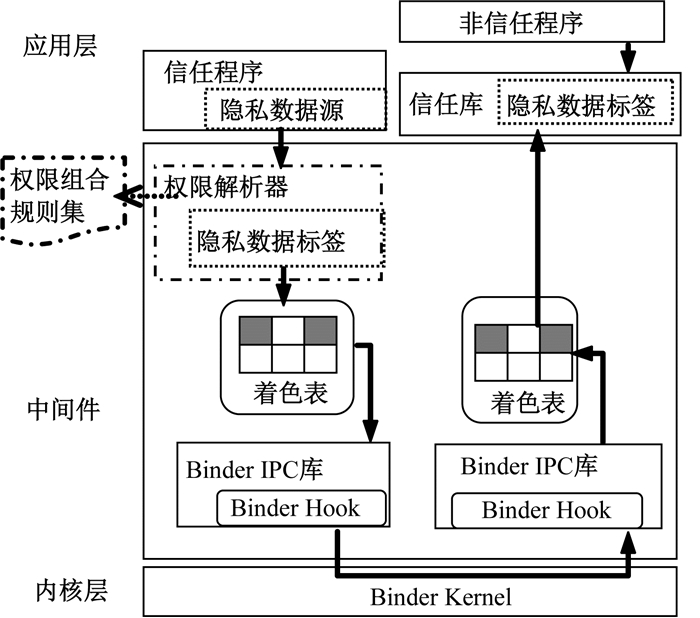 运行时权限改进主要解决Android权限提升攻击问题,即没有任何权限的恶意程序能够通过第三方程序获得所需的权限[7]。文献[8]提出一个检测权限提升的工具,通过传播访问路径来统一数组和访问映射,减少由于字段不敏感和数组访问与映射访问近似所导致的误报,但系统开销大且算法时间复杂度高。文献[9]提出一种权限提升攻击检测与防护方法,通过监视来自应用程序进程的重要函数调用,来阻止试图进行权限提升的系统调用。文献[10]设计并实现了一个数据流动态追踪系统TaintDroid,该系统对用户敏感数据进行标记并维护标记的传播,当检测到带有标记的污点数据通过网络等途径离开时,则在日志文件中记录带标记的隐私数据、传输该数据的应用程序以及数据传输的目的地等信息。