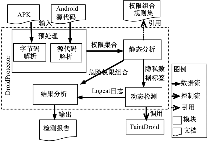 图 2 基于扩展权限组合的隐私数据泄露检测框架 Fig. 2 Privacy leak detection framework based on extended permission combination |