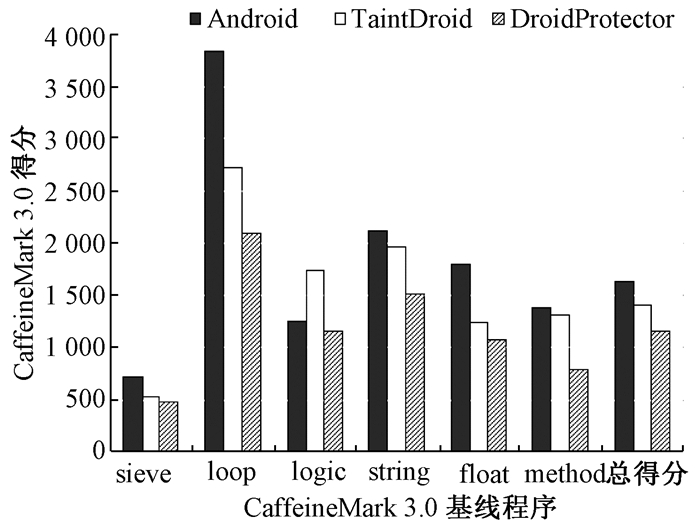 由于DroidProtector的动态检测模块是通过扩展TaintDroid实现的,因此通过比较DroidProtector和TaintDroid性能来评估扩展所导致的性能开销。此外,通过比较DroidProtector和Android平台的性能来评估DroidProtector在检测Android应用程序时的时间效率。CaffeineMark[15]是一个广泛的用来比较不同平台上Java程序执行速度的工具。该工具提供了一组基线程序集(包括sieve、loop、logic、string、float、method),采用每秒执行的Java指令数作为度量指标。本文采用CaffeineMark 3.0评估与比较DroidProtector、TaintDroid和Android三个系统的性能,测试结果如图 4所示,其中“总得分”表示所有基线程序的总体得分,DroidProtector、TaintDroid和Android的总体性能得分别为1 152、1 403和1 620。实验结果表明:①与TaintDroid的性能相比,DroidProtector虽然以17.89%的性能开销为代价(主要用于危险权限组合的识别与判断、短信出口检测),但大幅度提高了应用程序的隐私数据泄露的检测能力。②与Android的性能相比,DroidProtector的性能下降了28.89%。这意味着在使用DroidProtector检测Android程序时性能开销只有28.89%,而基于指令层插桩工具的性能开销通常为2~20倍。