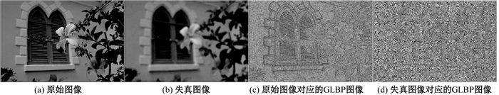 式(5)定义了均匀性,u是均匀尺度,它的计算是逐比特进行的,即二进制序列从0到1、从1到0的跳变不超过2次.旋转不变性表现在GLBP通过计算中心像素和周围像素梯度值的差,生成一个二值序列来描述边缘,而二值序列中0和1的相对位置并不会因为图像的旋转而产生变化.通过上述优化过程,旋转不变的均匀GLBP只含有P+2种模式.GLBP模式并不是保持不变的,当图像产生失真时,它会从一种模式向另一种模式转换,这样GLBP就能更有效地描述不同失真对图像的影响.图 1列出了一张原始图像以及其产生混合失真之后的GLBP图像,显然,混合失真使得图像的结构信息严重丢失.