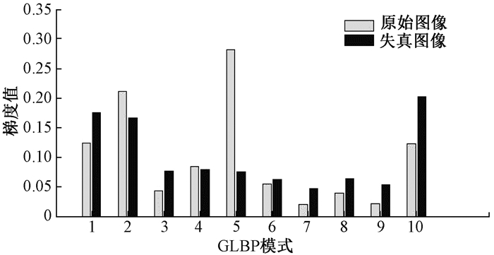 获得失真图像的GLBP图像后,使用梯度加权直方图来表达图像的结构特征.权值由像素点的梯度值代表,实验中P取8,所以一共有10种GLBP模式,对梯度图中具有相同模式的像素点的梯度幅值进行统计,即可得到梯度加权直方图.图 2为原始图像与失真图像梯度加权直方图的比较.可以看出,失真前后的梯度加权直方图不同,这也证明了GLBP对结构信息描述的有效性[12].人眼在评价图像质量时,会受到观察条件的影响,人眼感受到的图像失真与观察距离及图像分辨率都有关系[8].因此,对原始图像进行了4次下采样,获得5个尺度上的图像并进行结构信息提取,以获得图像更多的细节信息,然后产生了5个不同尺度上的梯度加权直方图,得到总共50维的图像结构特征.