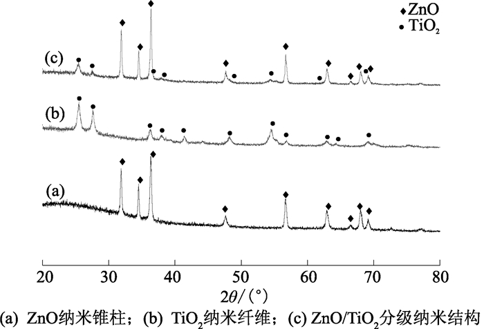 2 结果与讨论 2.1 物相与形貌表征图 1为ZnO纳米锥柱、TiO2纳米纤维和ZnO/TiO2分级纳米结构的XRD图.由图 1(a)可知,ZnO纳米锥柱的衍射峰与ZnO六方纤锌矿结构(JCPDS 36-1451) 的晶面相吻合,ZnO衍射峰尖锐对称,且没有其他杂峰出现,表明ZnO纳米锥柱结晶化良好.由图 1(b)可知,TiO2纳米纤维的衍射峰既有锐钛矿相衍射峰(JCPDS 21-1272),又有金红石相衍射峰(JCPDS 21-1276),并且锐钛矿相为主相,这说明在500 ℃空气气氛中烧结制得的TiO2纳米纤维为锐钛矿相和金红石相共存的混合相.由图 1(c)可知,分级纳米结构中TiO2的晶体结构与TiO2纳米纤维的一致,这表明两步水热法制备ZnO纳米锥柱阵列的过程并未改变TiO2纳米纤维的晶体结构,同时分级纳米结构中ZnO纳米锥柱仍为六方纤锌矿结构.