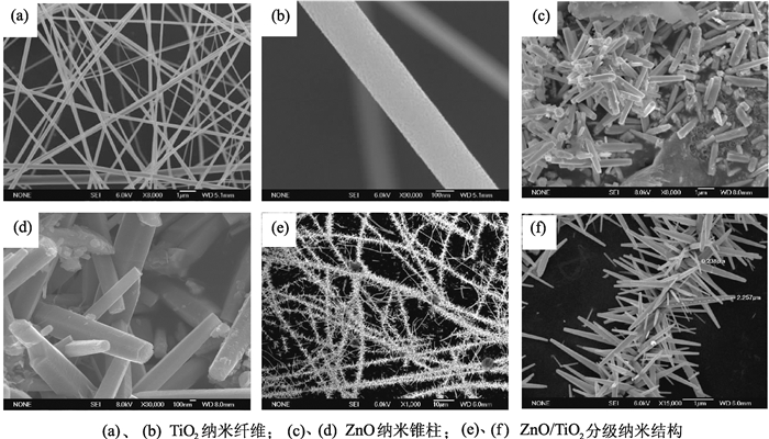 图 2为TiO2纳米纤维、ZnO纳米锥柱和ZnO/TiO2分级纳米结构的SEM图.由图 2(a)可知,通过静电纺丝法制备的TiO2纳米纤维直径较为均匀,纤维之间相互不粘连,直径为300 nm左右.由图 2(b)可知,TiO2纳米纤维是由许多TiO2晶粒组成的纤维结构.图 2 (c)、(d)为ZnO的形貌图,可以看出,水热法制备的ZnO为纳米锥柱状结构,直径为200~500 nm,纳米锥柱长度约为3 μm.图 2(e)、(f)为ZnO/TiO2分级纳米结构在不同放大倍率下的SEM图,可以看出,ZnO纳米锥柱状结构均匀地生长在TiO2纳米纤维表面,形成ZnO纳米锥柱阵列,且ZnO纳米锥柱直径为100~300 nm,长度为2.5~3 μm,这同通过水热法单独制备的ZnO纳米锥柱相比直径有所减小.水热法制备ZnO一维纳米结构通常分为形核与生长两个阶段.与水热法直接制备ZnO一维纳米结构相比,以TiO2纳米纤维作为模板,将会更有利于ZnO的形核,从而在TiO2纳米纤维表面获得数量更多且粒径更小的纳米粒子,因此,在TiO2纳米纤维表面生长的ZnO纳米锥柱直径会小于水热法直接制备的ZnO纳米锥柱的直径.本实验中硝酸锌及六次亚甲基四胺的浓度均为0.01 mol/L,小于文献[16-17]中常用水热液的浓度,在随后一维纳米结构的生长阶段,Zn盐的浓度会迅速降低,从而导致制得的ZnO一维纳米结构沿着生长方向的直径逐渐减小[18],形成ZnO纳米锥柱结构,与文献[19-20]的研究结果一致.由图 2(e)、(f)还可以看出,ZnO/TiO2分级纳米结构表面疏松,预计该分级纳米结构将会更有利于对气体进行吸附与脱附,从而提高材料的气敏性能如灵敏度、响应恢复时间等.