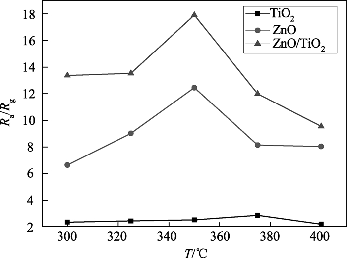 图 3 TiO2纳米纤维、ZnO纳米锥柱及ZnO/TiO2分级纳米结构气敏元件的灵敏度与工作温度的关系曲线 Figure 3 Sensitivity of the TiO2 nanofibers, ZnO nanorods and ZnO/TiO2 hierarchical nanostructures sensors as a function of the working temperature |