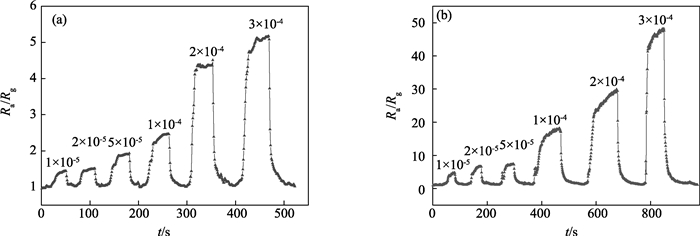 在工作温度为350 ℃时,TiO2纳米纤维和ZnO/TiO2分级纳米结构对丙酮气体的响应恢复曲线如图 4所示,气体体积分数范围为1×10-5~3×10-4.可以看出,无论是TiO2纳米纤维还是ZnO/TiO2分级纳米结构,气敏元件灵敏度均能恢复到初始状态,随着丙酮气体体积分数的增大,元件灵敏度均呈现出增大的趋势.TiO2纳米纤维及ZnO/TiO2分级纳米结构气敏元件的灵敏度随丙酮体积分数的变化关系如图 5所示.可以看出,当丙酮体积分数为1×10-5时,ZnO/TiO2分级结构传感器的灵敏度值为4.50,而TiO2纳米纤维的则只有1.43,二者灵敏度的比值为3.15;当丙酮体积分数为1×10-4时,ZnO/TiO2分级结构传感器的灵敏度值为17.91,而TiO2纳米纤维的则只有2.50,二者灵敏度的比值为7.16;当丙酮体积分数为3×10-4时,ZnO/TiO2分级结构传感器的灵敏度值为47.61,而TiO2纳米纤维的则只有5.16,二者灵敏度的比值为9.23.由此可以看出,尽管TiO2纳米纤维及ZnO/TiO2分级纳米结构气敏元件的灵敏度均随丙酮体积分数的增加而增大,然而ZnO/TiO2分级纳米结构气敏元件灵敏度的增大趋势明显高于TiO2纳米纤维气敏元件,且二者在丙酮体积分数为3×10-4时均未达到饱和状态.