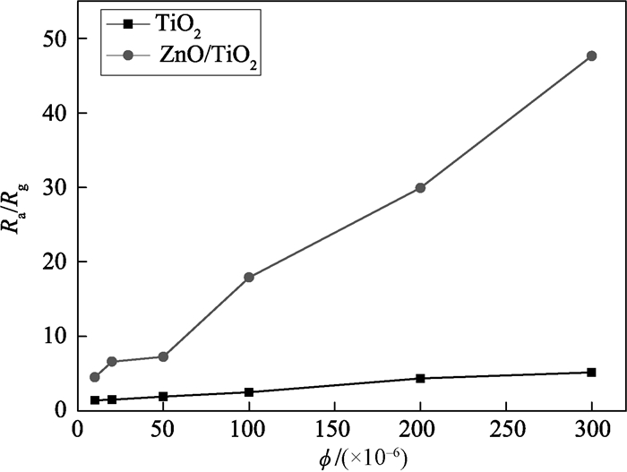 图 5 TiO2纳米纤维和ZnO/TiO2分级纳米结构对丙酮气体的灵敏度曲线 Figure 5 Sensitivity of the TiO2 nanofibers and ZnO/TiO2 hierarchical nanostructures to acetone |