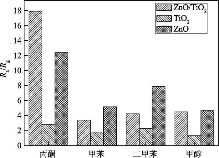 3 结论采用静电纺丝法制备出TiO2纳米纤维,并以TiO2纳米纤维作为模板,通过水热法在TiO2纳米纤维表面生长ZnO纳米锥柱阵列,制备出形貌可控的ZnO/TiO2分级纳米结构材料.使用ZnO/TiO2分级纳米结构制作的气敏元件,在工作温度350 ℃下,对体积分数为1×10-5~3×10-4的丙酮气体的气敏特性进行研究,结果表明,与ZnO纳米锥柱和TiO2纳米纤维气敏元件相比,ZnO/TiO2分级纳米结构气敏元件具有更高的灵敏度,且对丙酮具有较好的选择性.