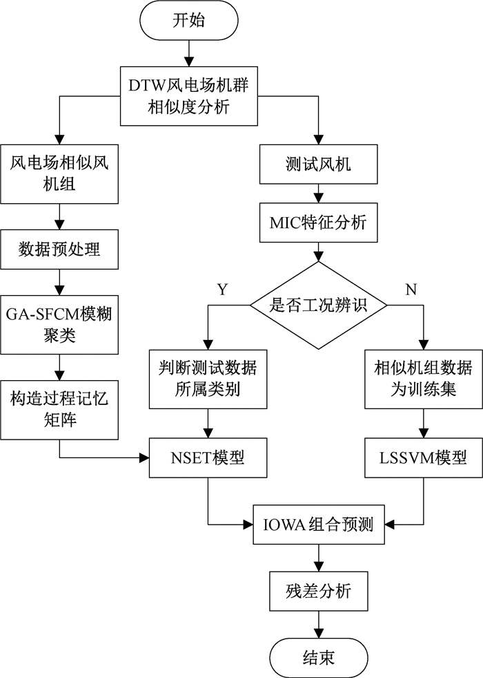 对风电场的风机进行基于DTW算法的相似度分析,划分出待测试风机及相似风机组,以相似风机组的正常工况数据作为构建预警模型的训练数据。采用GA-SFCM算法对正常工况数据进行聚类运算,构造不同的过程记忆矩阵,建立相应的NSET模型。依据工况辨识测试风机数据,得到NSET预测输出结果;而以相似风机组数据为训练集的LSSVM模型得到LSSVM预测结果。基于IOWA算子组合两种模型的预测结果,得到变权的组合预测模型,计算并分析预测结果与实际值之间的残差,实现对风电机组的故障检测。通过将测试机组与其邻比机组分开,提高了测试数据的独立性和邻比机组的数据利用率。风电机组齿轮箱温度预警流程如图 2所示。
