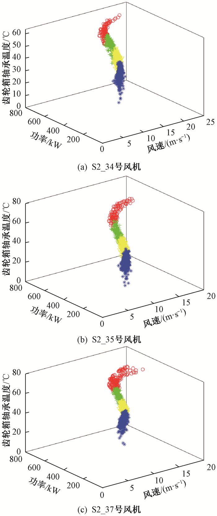 以齿轮箱轴承温度为研究对象,由于以风速为输入、有功功率为输出的“黑箱”模型能表征风机的运行状态,因此选择风速、有功功率和齿轮箱轴承温度为聚类变量。对S2_36号风机相似机群的其他风机正常工况数据进行聚类,3台风机的聚类结果如图 3所示。通过聚类结果可知,在所选的聚类变量作用下,可以得到不同工况下模型的训练集。
