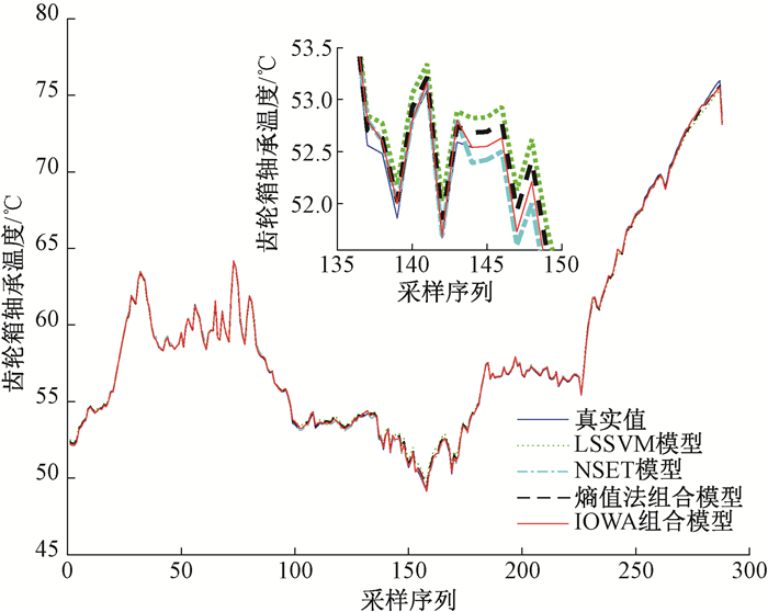 建立基于IOWA算子的组合模型进行温度预测,为证明该模型的有效性,还建立了LSSVM模型、NSET模型和熵值法组合模型进行对比分析。图 4为不同模型的预测结果。