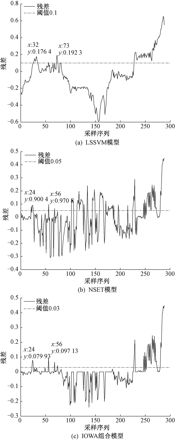 从图 5(a)可以看出,没有划分工况的LSSVM模型的残差很好地保持了原数据的波动情况,具有较好的时间连续性,但LSSVM模型的预测精度较低。其在数据点32处达到第一个波峰,此处可作预警点;在数据点73处,残差再次超过设定的阈值,此处可作报警点。从图 5(b)可以看出,NSET模型的残差值小于LSSVM模型,预测精度更高。其在数据点24处超出阈值,达到第一个波峰,此处可作预警点;在数据点56处再次达到波峰,此处可作报警点。从图 5(c)可以看出,IOWA组合模型的波形频率较NSET模型大大降低,使得数据点的有效性增强,强化了预警的准确性和可靠性。其在数据点24处第一次超出阈值,此处可作预警点;在数据点56处再次超出阈值,此处可作报警点。