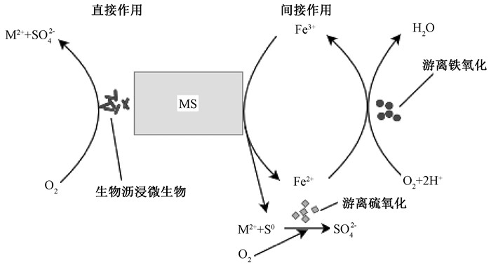 1) 直接作用:细菌可以借助自己分泌的胞外多聚物黏附在污泥中金属硫化物(MS)的表面,通过菌体胞内独特的氧化酶系统将MS直接氧化,最终形成可溶性硫酸盐(MSO4)(式(1))。