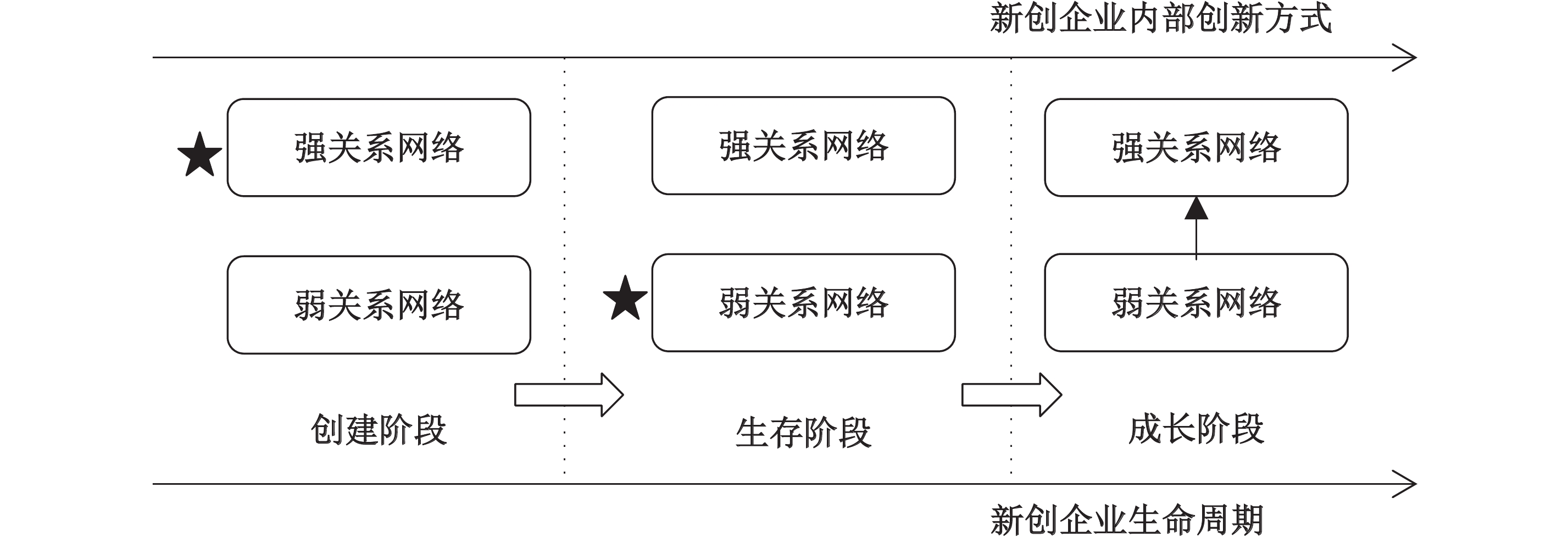 那么在技术逻辑导向下,新创企业生命周期所展现的不同阶段目标为何会造成创新方式和社会关系网络选择上的差异呢?一方面,与现有企业相比,新创企业创新受到企业内外环境的双重影响比较大(王俊雄和王建华,2016),因此新创企业在不同的发展阶段会针对内外环境的不同而采取不同的创新策略。另一方面,在技术逻辑导向下,新创企业的总体目标是通过技术创新提升研发能力。因此,在不断发展的过程中,新创企业内部技术创新必然会不断升级,并与此同时对组织制度创新提出挑战(盛亚和吴建中,1998)。而新创企业外部关系网络能为内部创新提供外部技术和有效的信息,降低创新失败率,成为解决不同阶段资源约束问题的必然选择(Cai等,2014),增加实现阶段性目标的可能性。因而在新创企业不同的生命周期阶段,创新方式和关系网络的结合和互动具有不同的特性。
